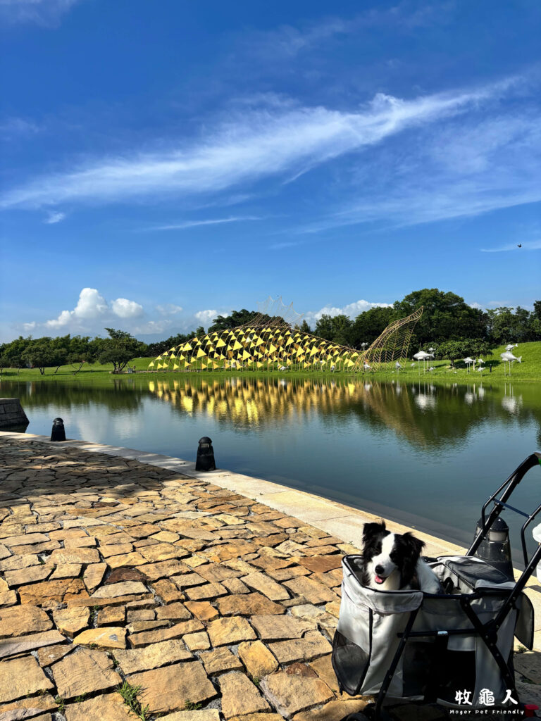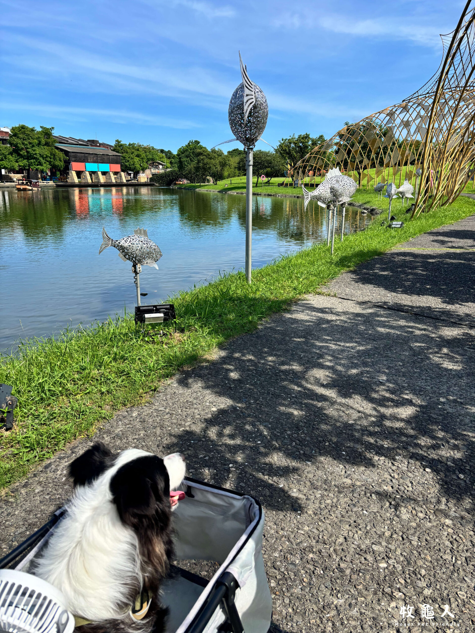 接著我們出發尋找一個重要的景點-「毛孩搖滾樂園」,專屬阿墨的寵物公園,於是以逆時鐘方向前進,沿途水岸與綠植,超級像在公園散步超舒服~穿過月橋後就能找到「毛孩搖滾樂園」啦!
