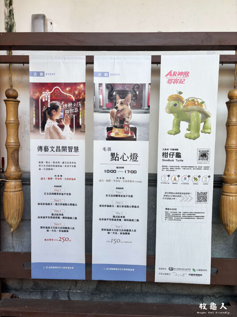 「文昌祠」供奉的是掌管學業與智慧的文昌帝君,是傳統社會中非常重要的信仰之一。點燈祈福是一種向神明祈求平安、健康與心願成真的習俗,宜蘭傳藝園區也推出了許多相關活動,其中特別推出「毛孩點心燈」活動,讓主人帶毛小孩到文昌祠祈福,現場也可免費領平安符,為寵物祈求健康平安、快樂成長。